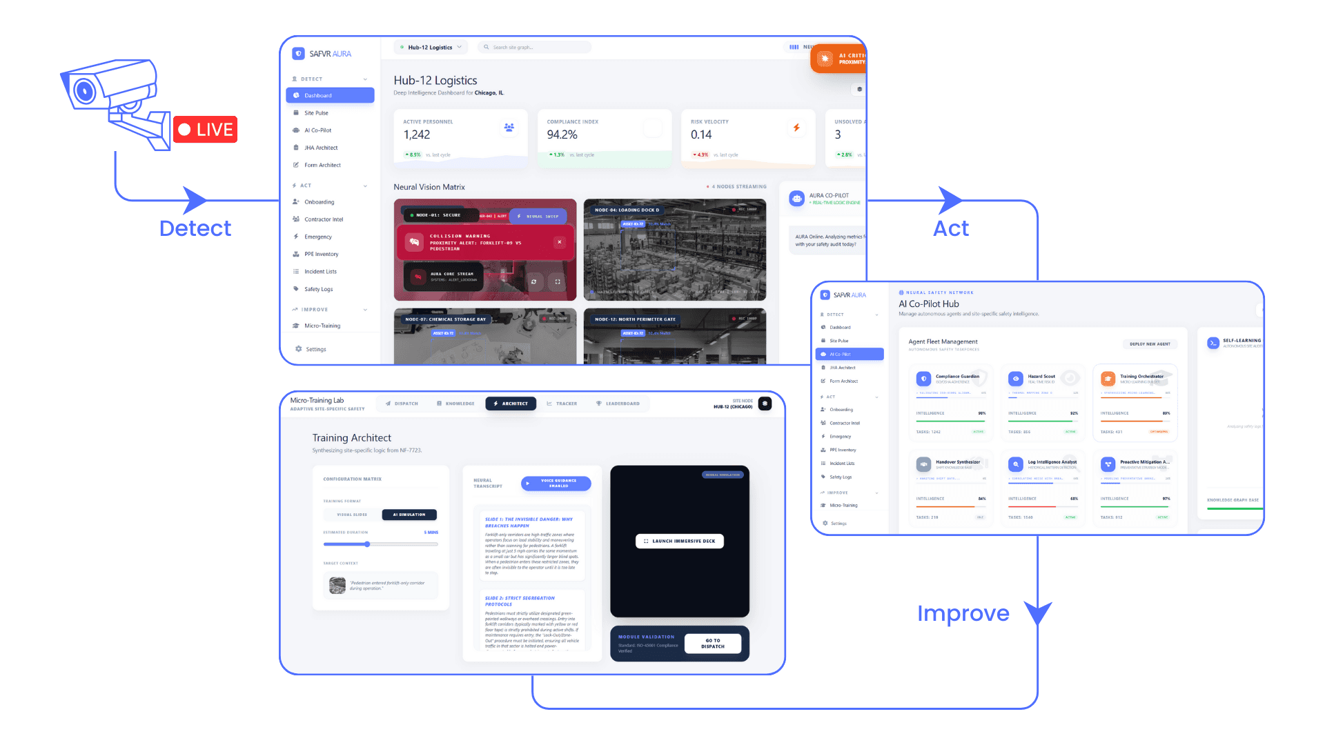 AURA is SAFVR’s adaptive AI engine that unifies safety data, incidents, and regulations to deliver clear, site-specific actions.