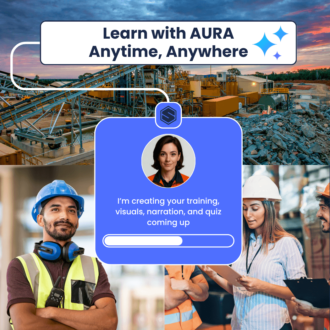 Upload an SOP, document, or site image, and AURA instantly builds a visual, narrated module complete with adaptive quizzes and local compliance alignment.